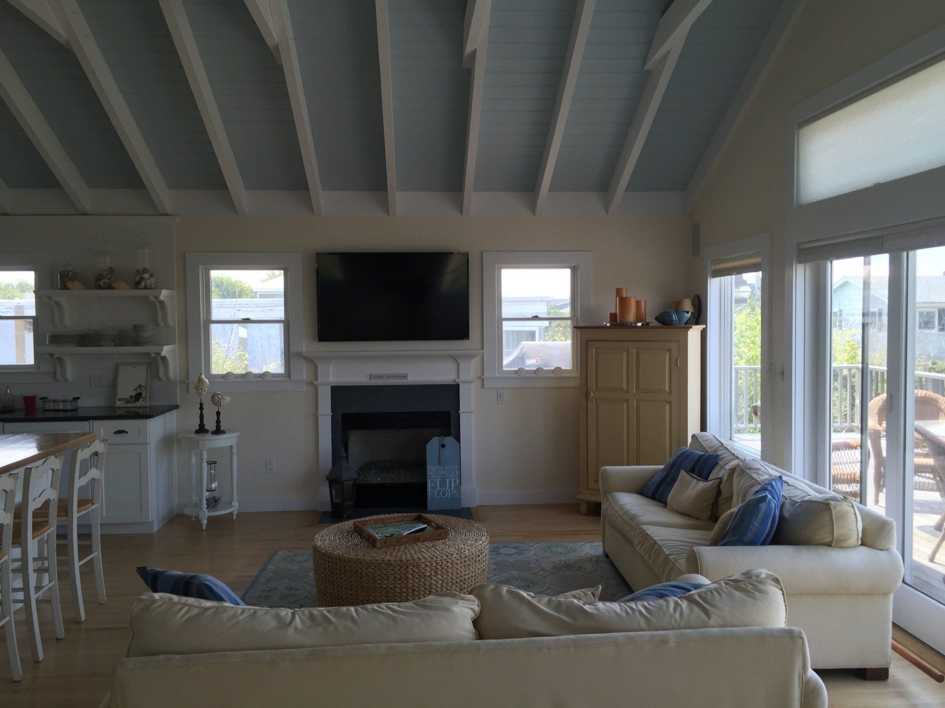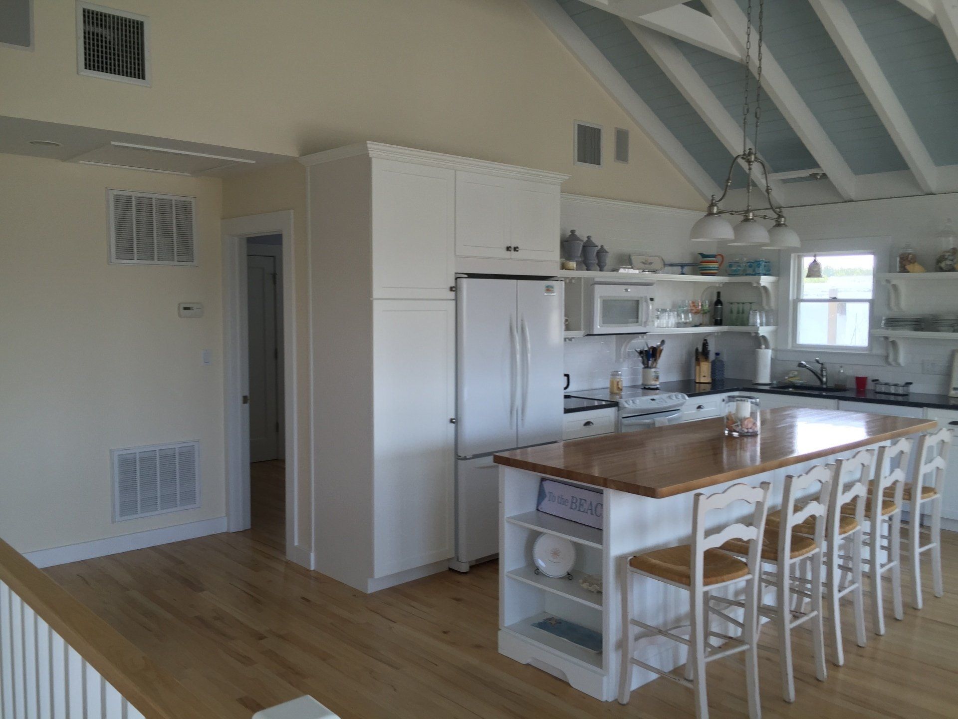 This is a 4 bedroom, 2 1/2 bath house. The second story has 1 bedroom, 1 1/2 baths and open concept kitchen/living area with a west facing upper deck for dining/grilling or just relaxing. The first floor has 3 bedrooms. one bathroom and another sitting/TV area. This level also has a private back deck with an outdoor shower. This home is like new with central A/C throughout the house. Features include central air conditioning, an alarm system, and a fireplace. Call for price!